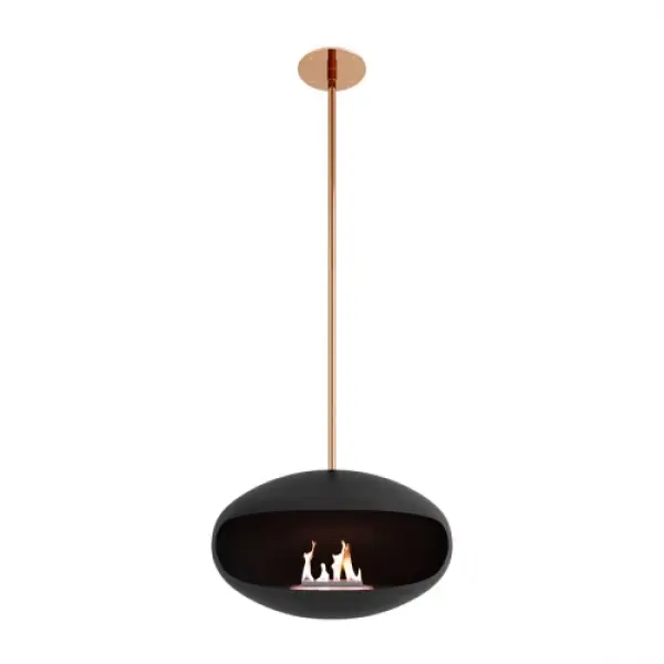 The Cocoon Fires Aeris with matte black shell and copper pole is a luxurious ceiling-suspended bioethanol fireplace, blending contemporary elegance with advanced functionality. Designed by Federico Otero, this fireplace delivers a clean, flue-free flame while serving as a sculptural centrepiece for modern interiors. The striking black-and-copper finish adds warmth and sophistication to living spaces, dining areas, and open-plan environments.